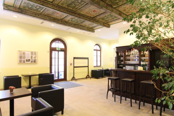 Gleichzeitig ist die Bar der Dreh- und Angelpunkt des Servicepersonals, welches Ihnen während der ganzen Veranstaltung zur Verfügung steht. Ausgestattet ist der Loungebereich durch mehrere Sitzecken. Die restaurierte Renaissance-Holzbalkendecke bietet dabei einen ganz besonderen Blickfang und lädt zusätzlich zum Verweilen an der Bar ein.